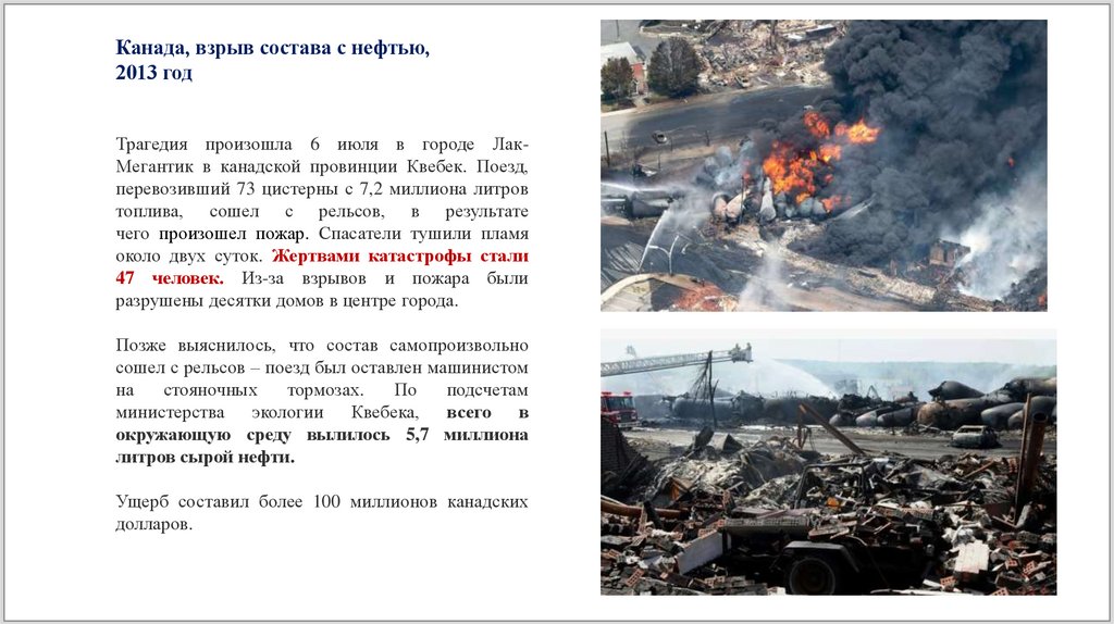 Трагедия произошла 6 июля в городе ЛакМегантик в канадской провинции Квебек. Поезд,