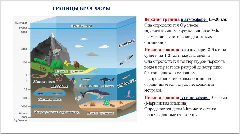 ГРАНИЦЫ БИОСФЕРЫВерхняя граница в атмосфере: 15–20 км.
