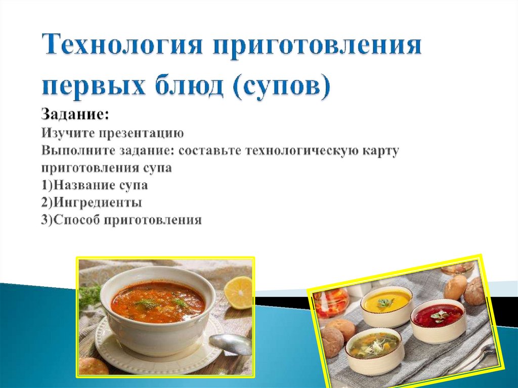 1. Технология приготовления первых блюд (супов) Задание: Изучите презентацию Выполните задание: составьте технологическую карту