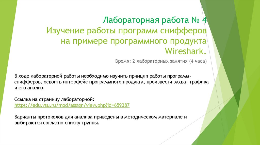 Время: 2 лабораторных занятия (4 часа)В ходе лабораторной работы необходимо изучить принцип работы программснифферов, освоить интерфейс программного продукта, произвести захват трафика