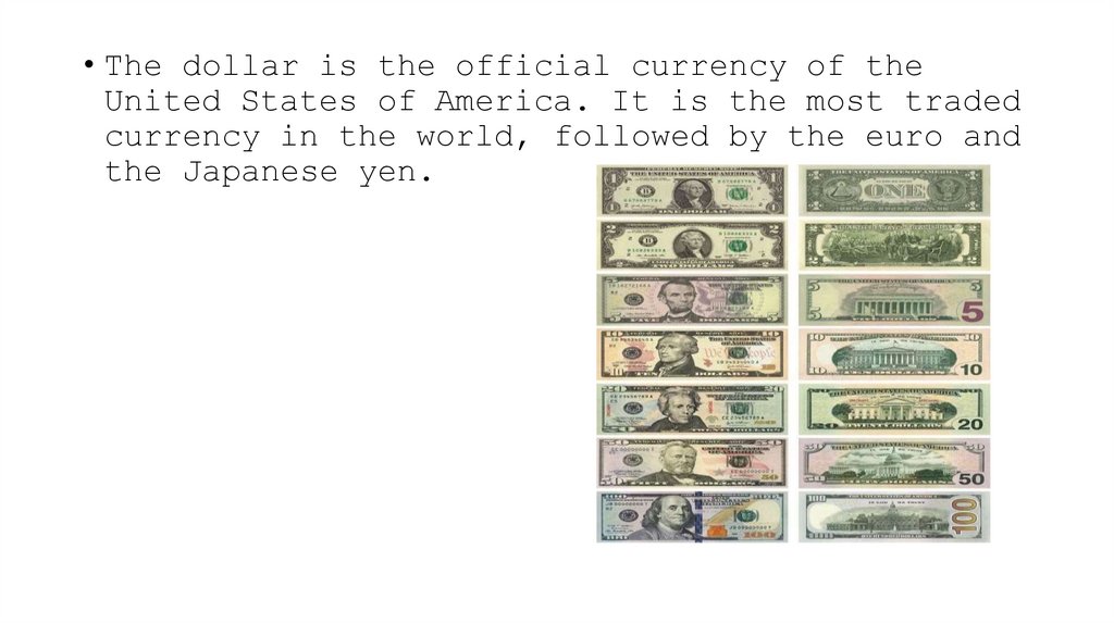• The dollar is the official currency of theUnited States of America. It is the most traded