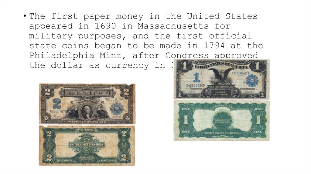 • The first paper money in the United Statesappeared in 1690 in Massachusetts for