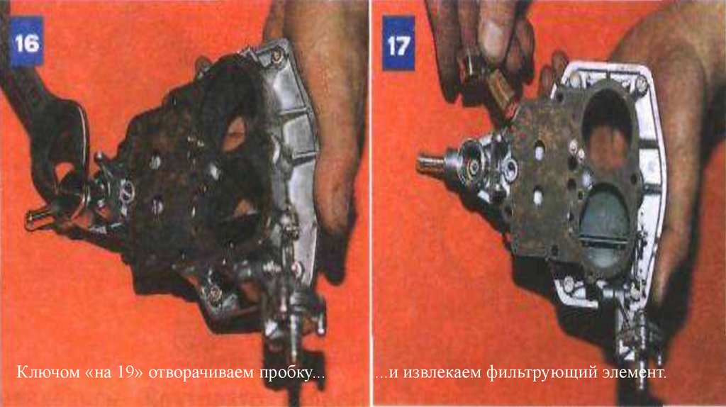 Ключом «на 19» отворачиваем пробку......и извлекаем фильтрующий элемент.