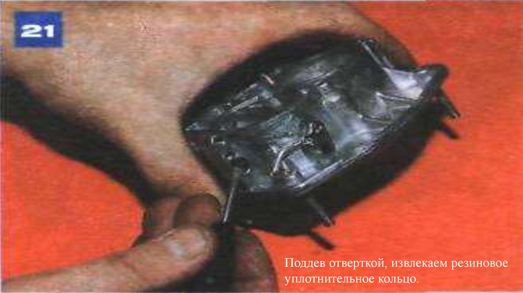 Поддев отверткой, извлекаем резиновоеуплотнительное кольцо.