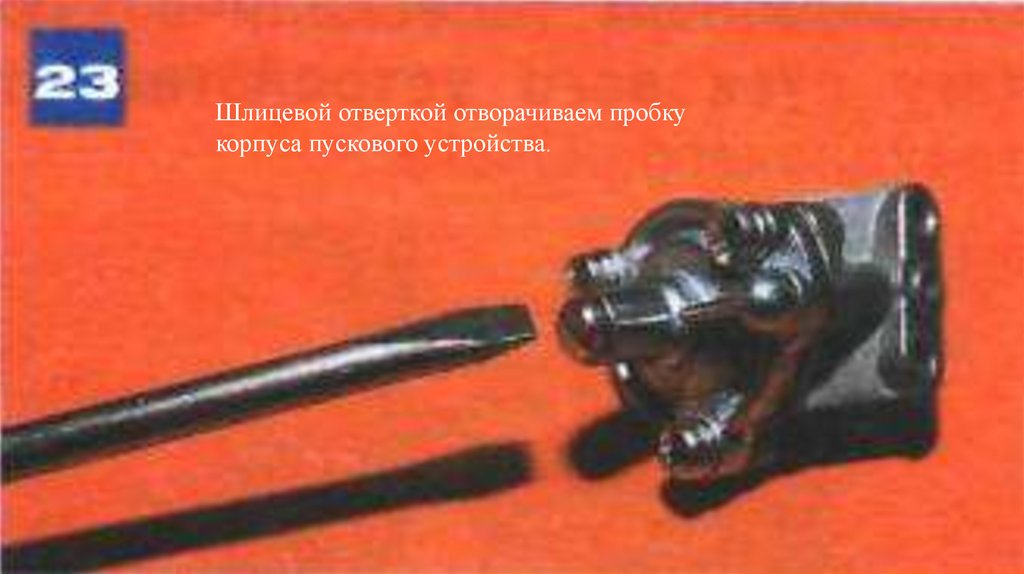 Шлицевой отверткой отворачиваем пробкукорпуса пускового устройства.