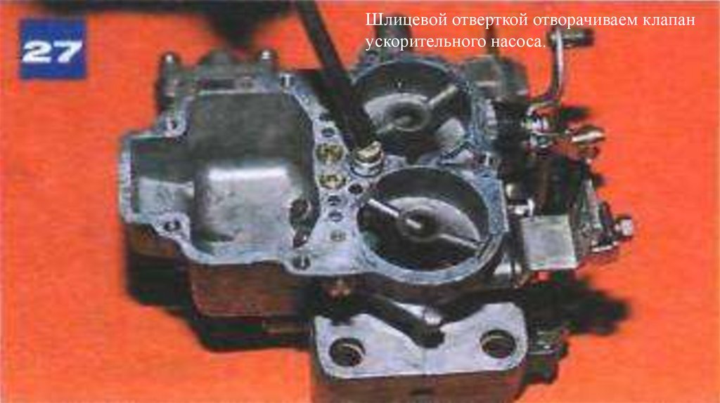 Шлицевой отверткой отворачиваем клапанускорительного насоса.