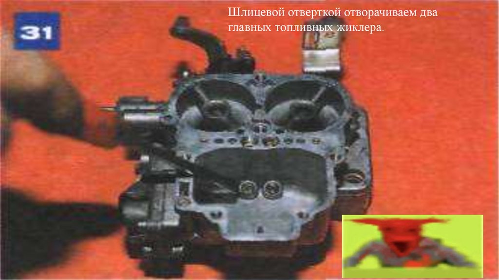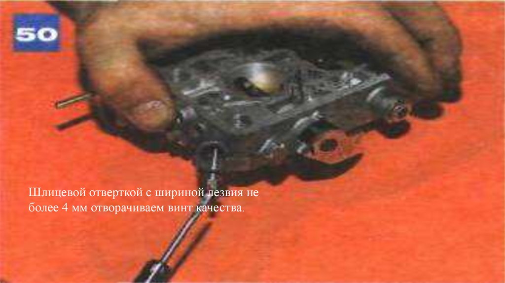Шлицевой отверткой отворачиваем корпустопливного жиклера холостого хода...