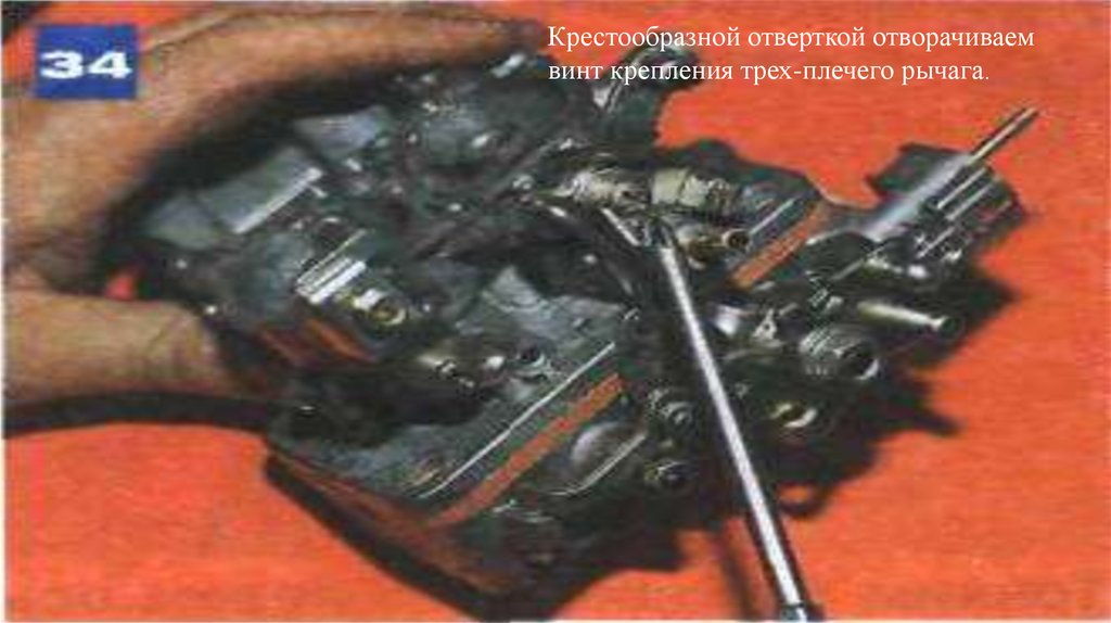 Крестообразной отверткой отворачиваемвинт крепления трех-плечего рычага.