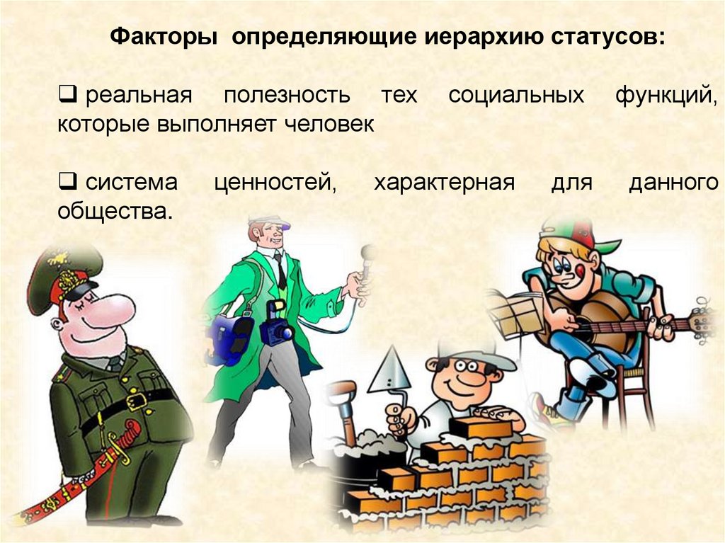 Факторы определяющие иерархию статусов:реальная полезность тех