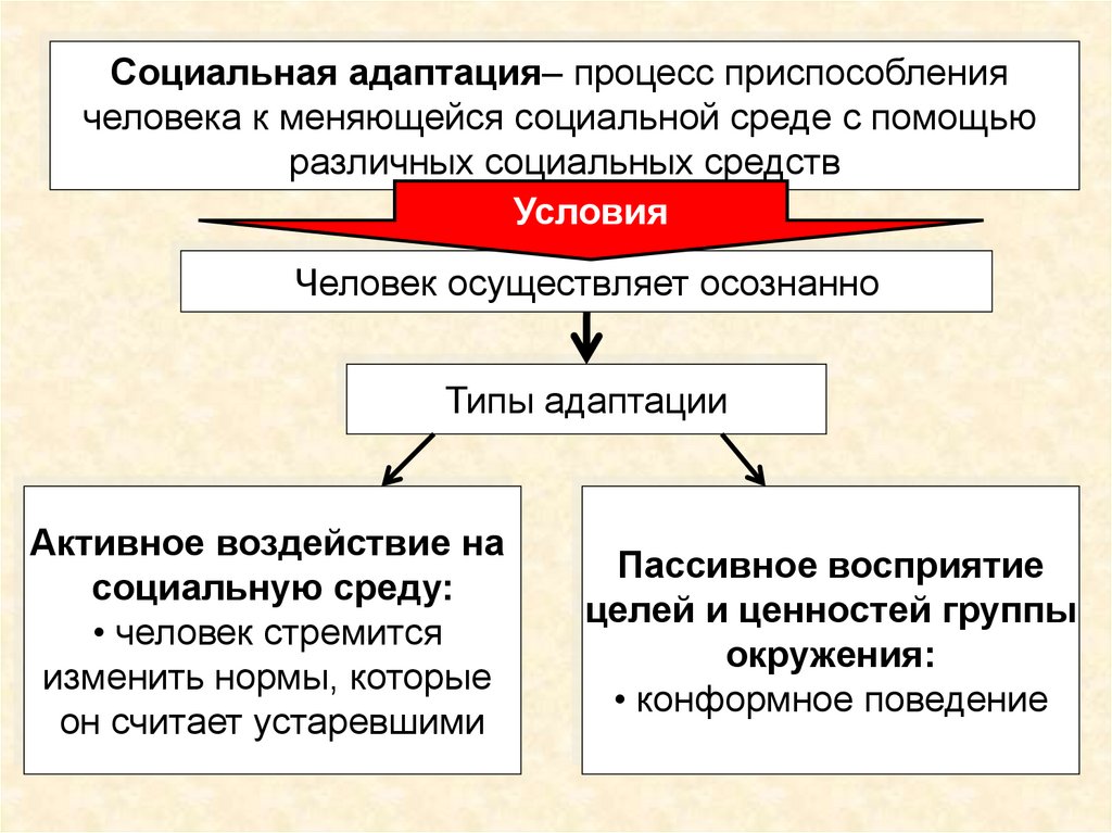 Социальная адаптация– процесс приспособлениячеловека к меняющейся социальной среде с помощью