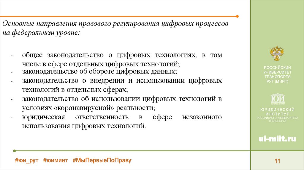 Основные направления правового регулирования цифровых процессовна федеральном уровне: