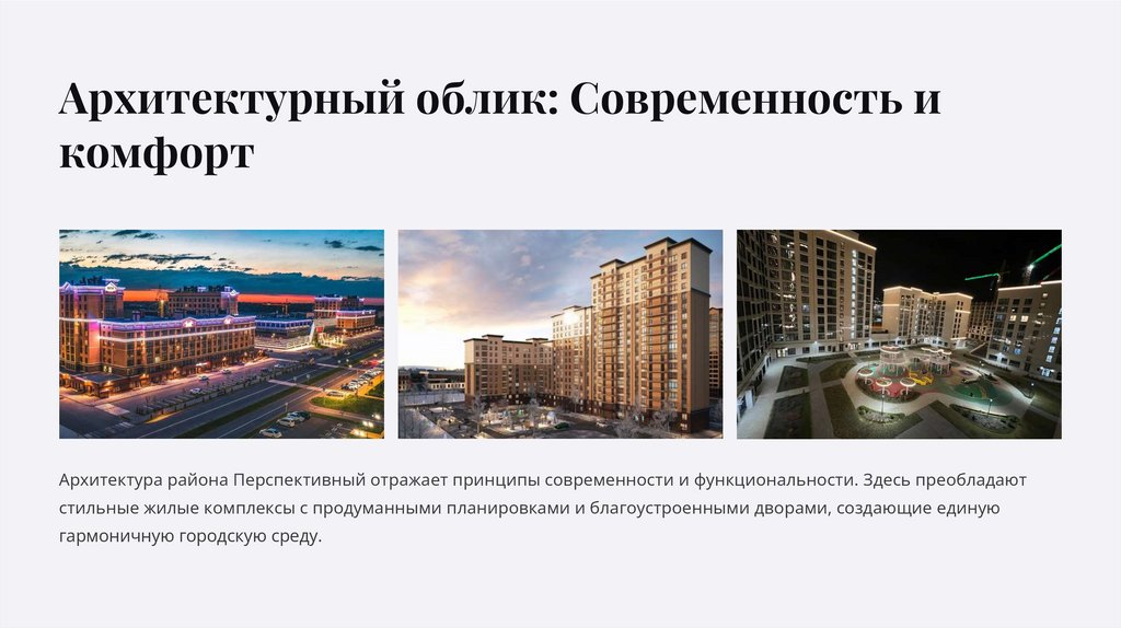 Архитектура района Перспективный отражает принципы современности и функциональности. Здесь преобладают
