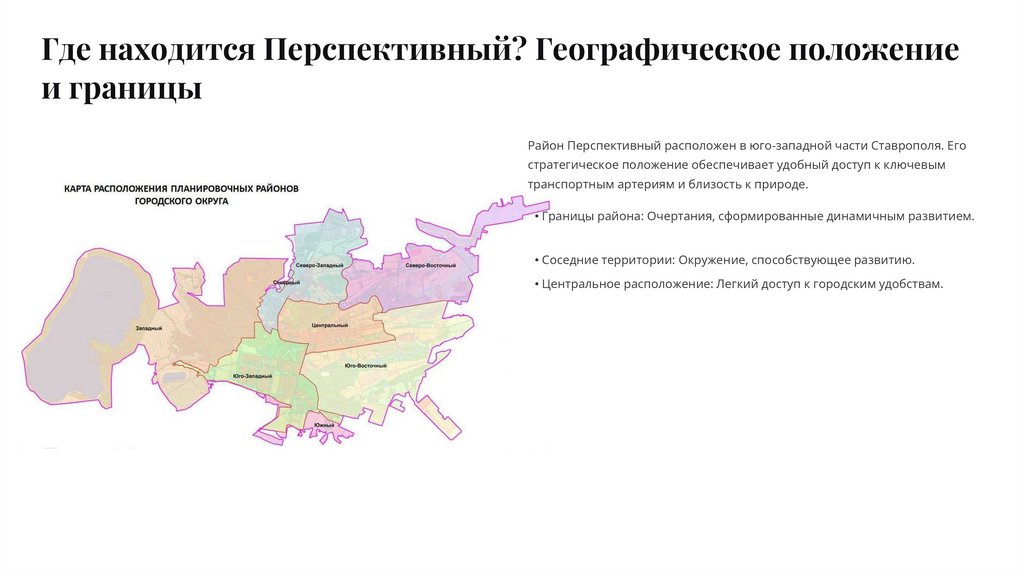 Район Перспективный расположен в юго-западной части Ставрополя. Его