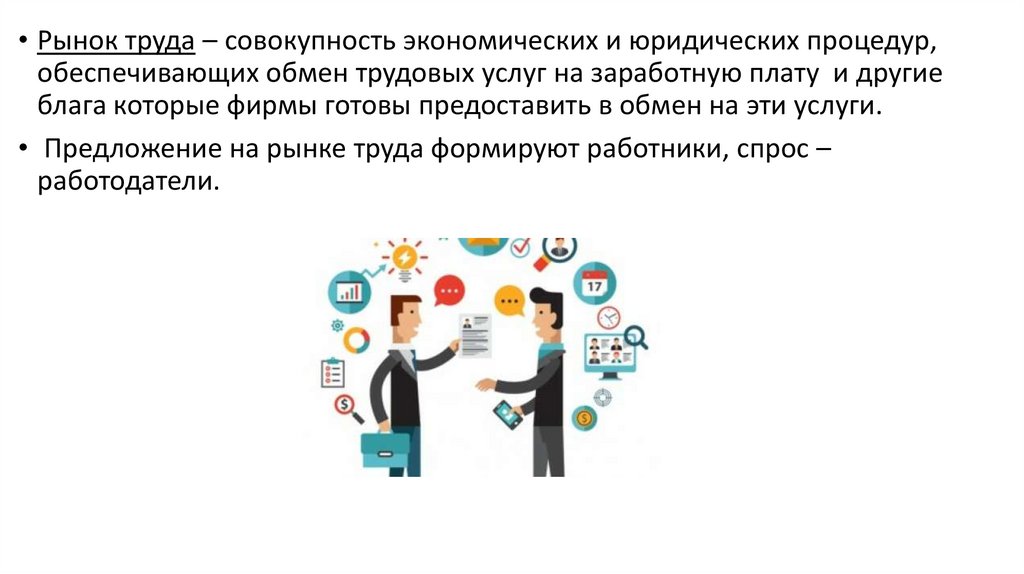 • Рынок труда – совокупность экономических и юридических процедур,обеспечивающих обмен трудовых услуг на заработную плату и другие