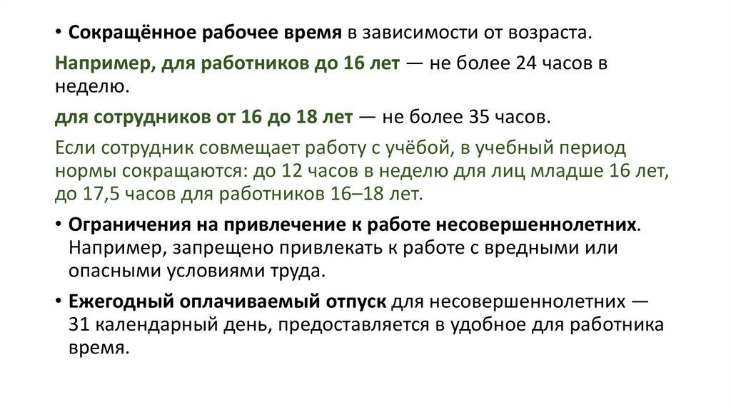 • Сокращённое рабочее время в зависимости от возраста.Например, для работников до 16 лет — не более 24 часов в