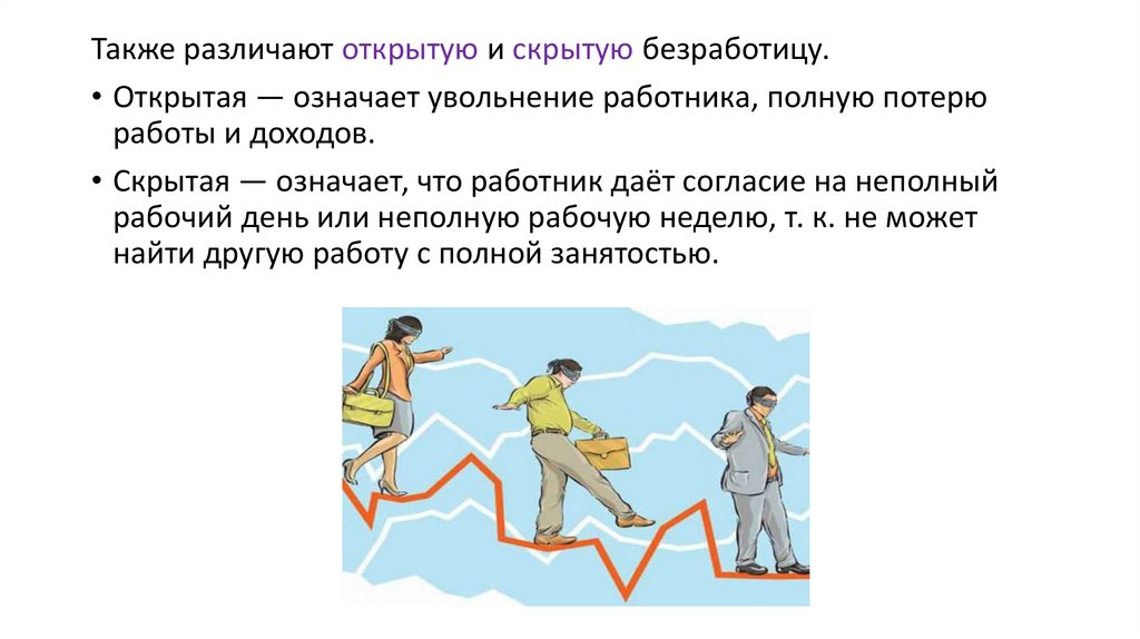 Также различают открытую и скрытую безработицу.• Открытая — означает увольнение работника, полную потерю