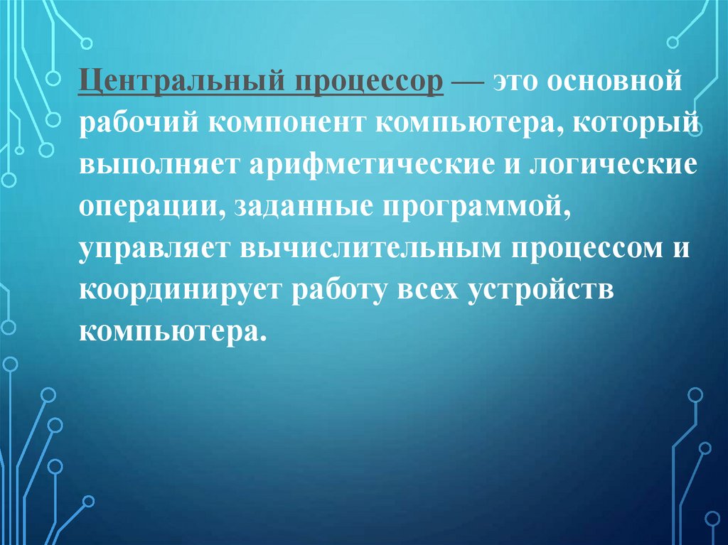 Центральный процессор — это основнойрабочий компонент компьютера, который