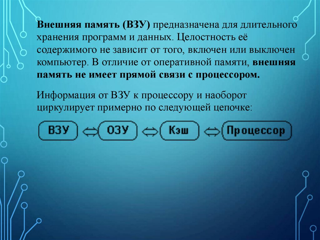Внешняя память (ВЗУ) предназначена для длительногохранения программ и данных. Целостность её