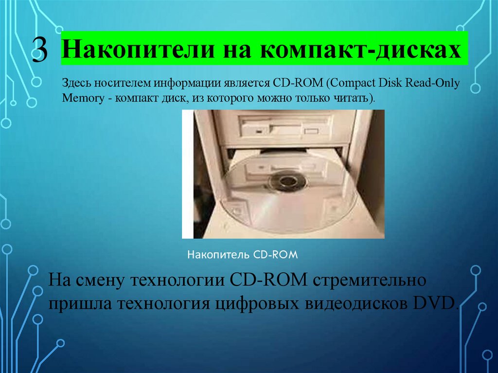 3 Накопители на компакт-дискахЗдесь носителем информации является CD-ROM (Сompact Disk Read-Only