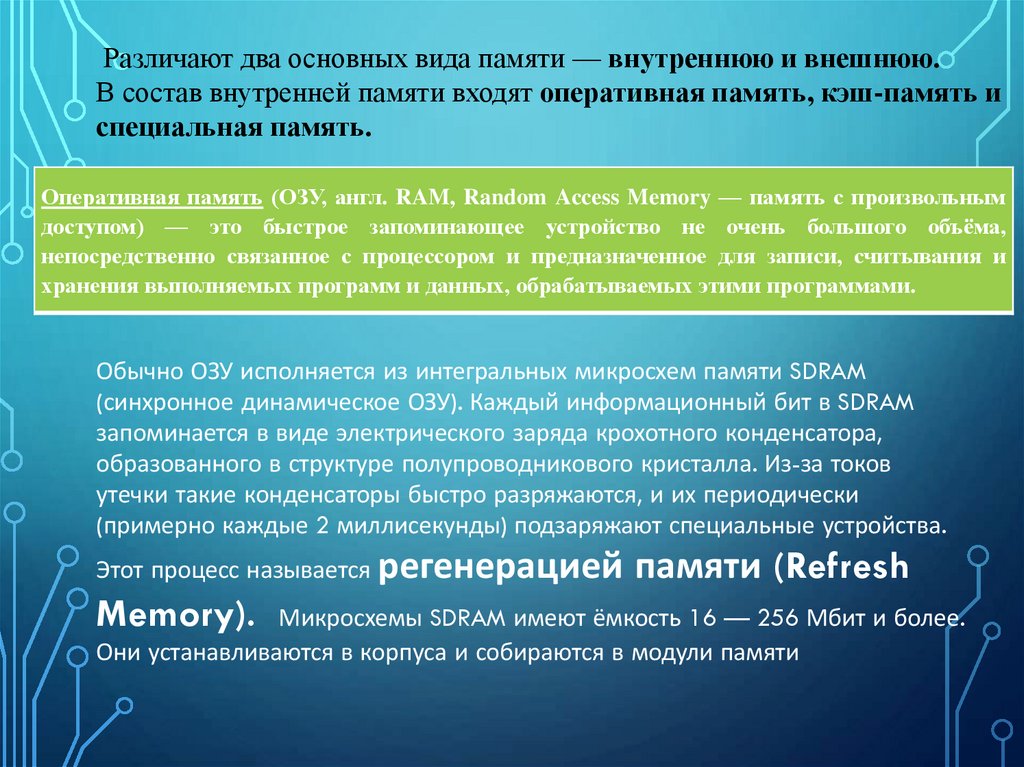 Различают два основных вида памяти — внутреннюю и внешнюю.В состав внутренней памяти входят оперативная память, кэш-память и