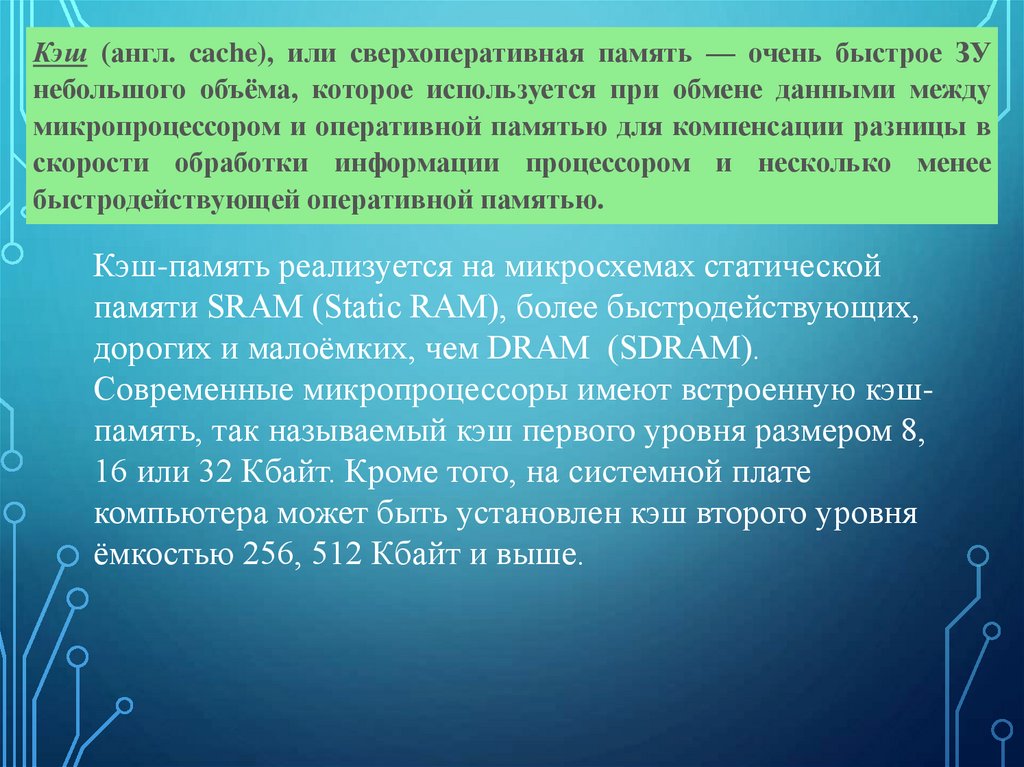Современные микропроцессоры имеют встроенную кэшпамять, так называемый кэш первого уровня размером 8,