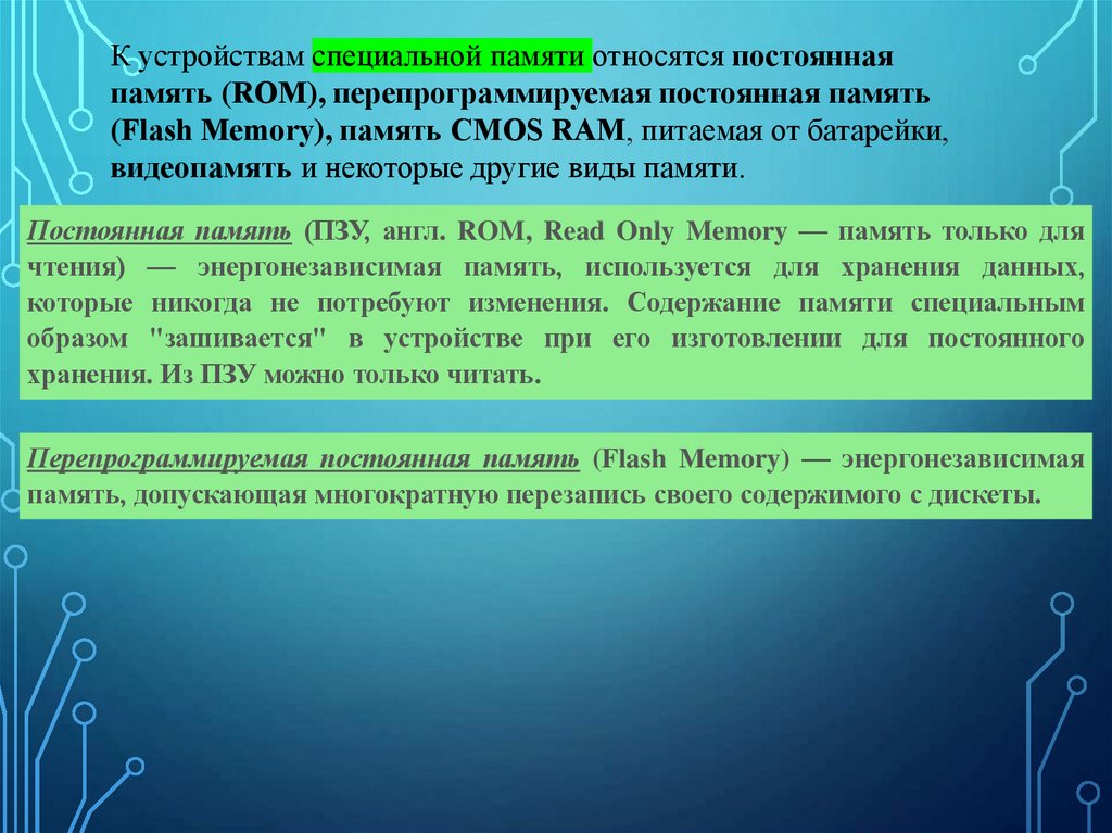 К устройствам специальной памяти относятся постояннаяпамять (ROM), перепрограммируемая постоянная память
