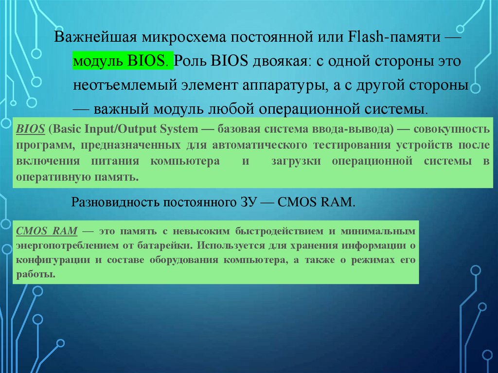 Важнейшая микросхема постоянной или Flash-памяти —модуль BIOS. Роль BIOS двоякая: с одной стороны это