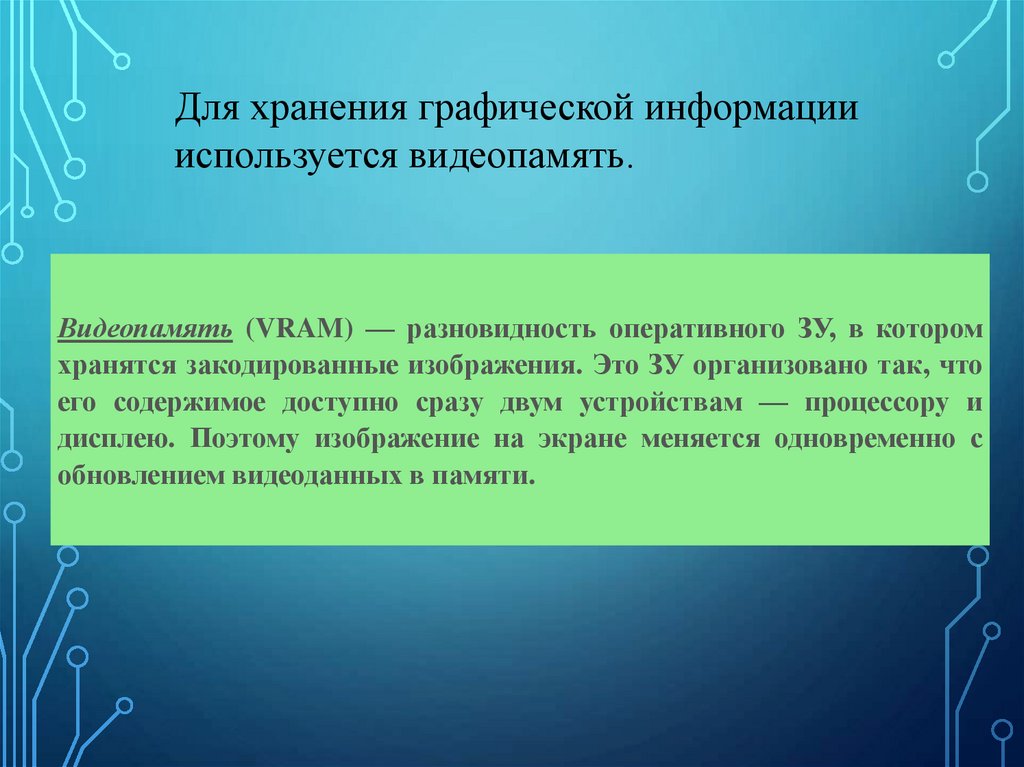 Видеопамять (VRAM) — разновидность оперативного ЗУ, в котором