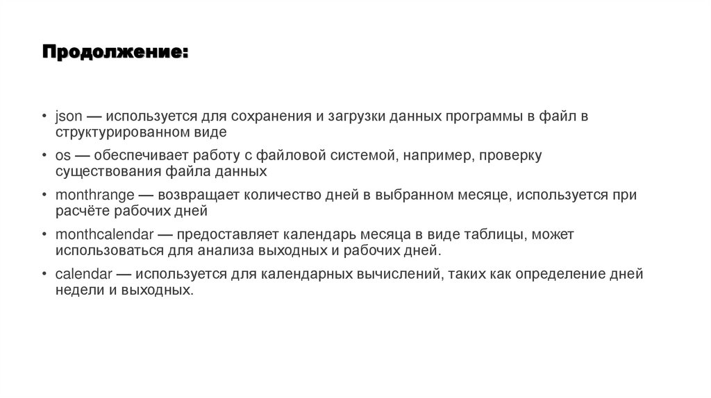 Продолжение:• json — используется для сохранения и загрузки данных программы в файл в