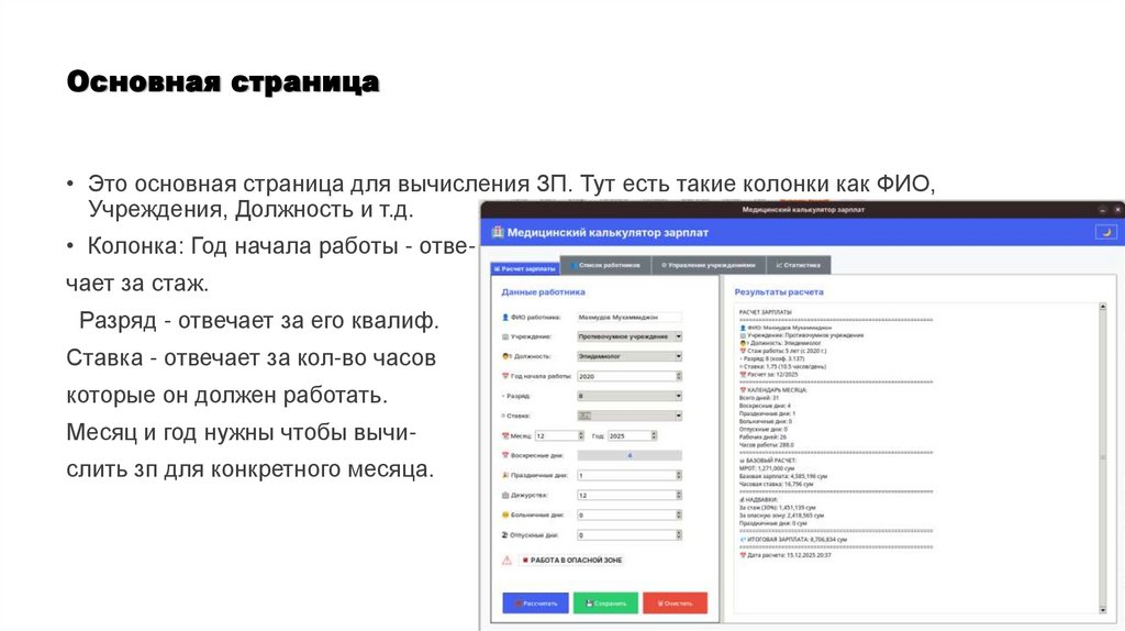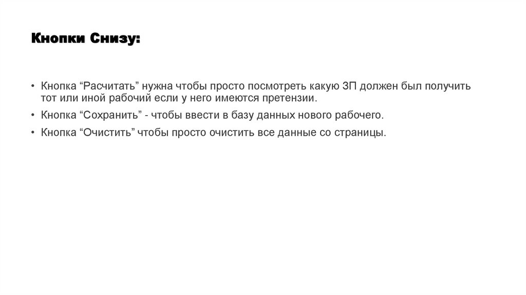Кнопки Снизу:• Кнопка “Расчитать” нужна чтобы просто посмотреть какую ЗП должен был получить