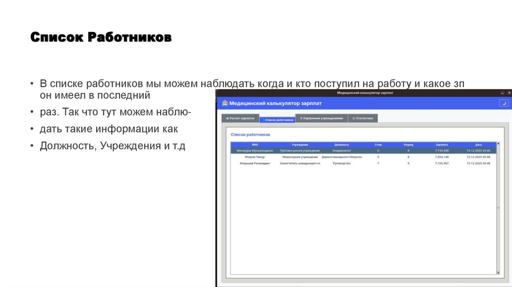 Список Работников• В списке работников мы можем наблюдать когда и кто поступил на работу и какое зп