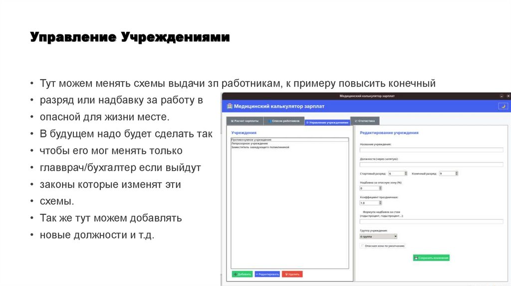 Управление Учреждениями• Тут можем менять схемы выдачи зп работникам, к примеру повысить конечный