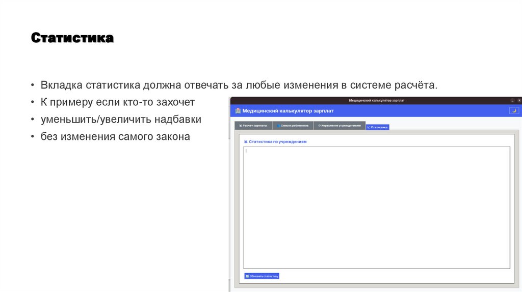 Статистика• Вкладка статистика должна отвечать за любые изменения в системе расчёта.