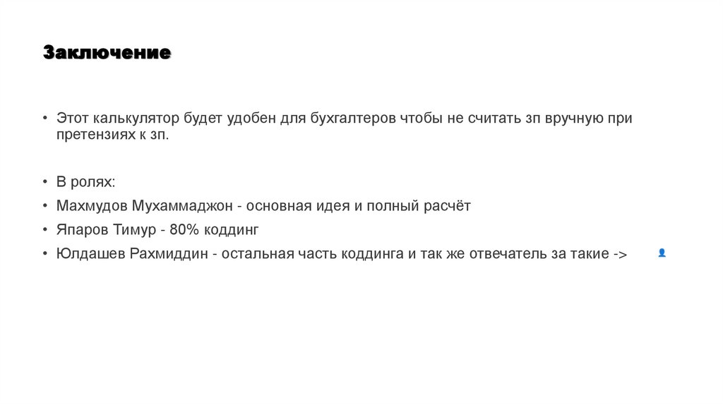 Заключение• Этот калькулятор будет удобен для бухгалтеров чтобы не считать зп вручную при