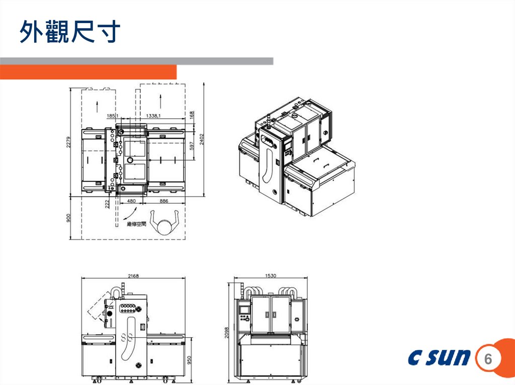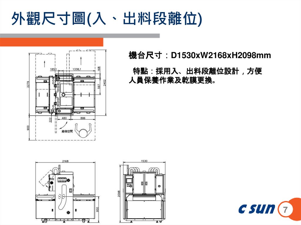 外觀尺寸圖(入、出料段離位)機台尺寸 D1530xW2168xH2098mm