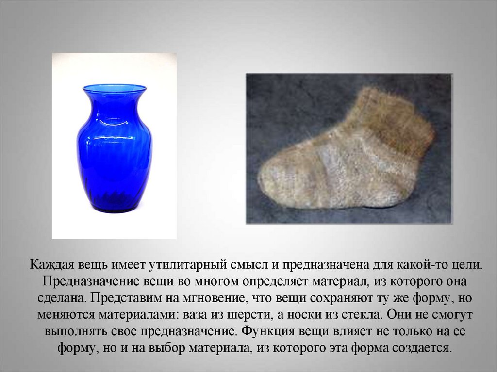 Каждая вещь имеет утилитарный смысл и предназначена для какой-то цели.Предназначение вещи во многом определяет материал, из которого она