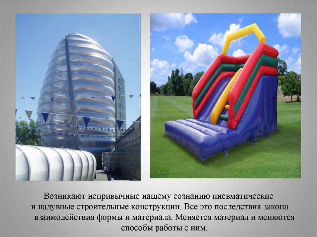 Возникают непривычные нашему сознанию пневматическиеи надувные строительные конструкции. Все это последствия закона