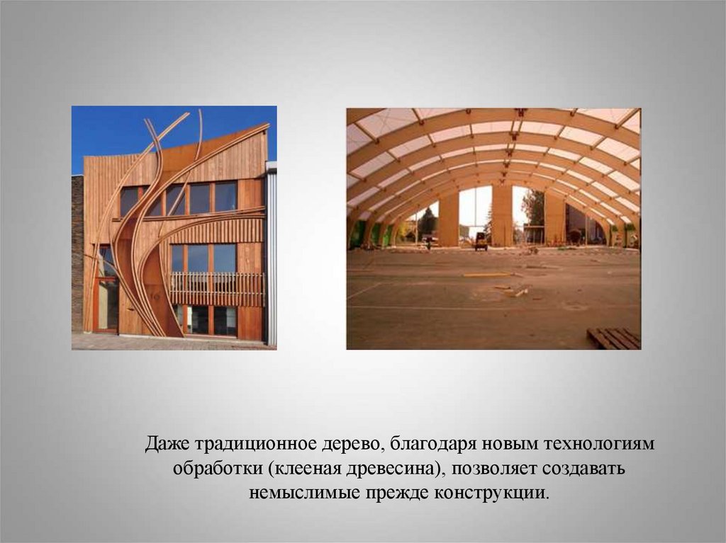 Даже традиционное дерево, благодаря новым технологиямобработки (клееная древесина), позволяет создавать