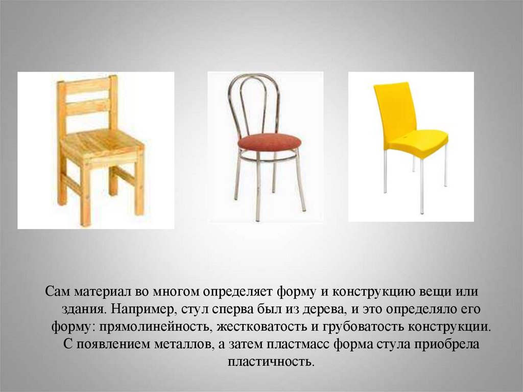 Сам материал во многом определяет форму и конструкцию вещи илиздания. Например, стул сперва был из дерева, и это определяло его