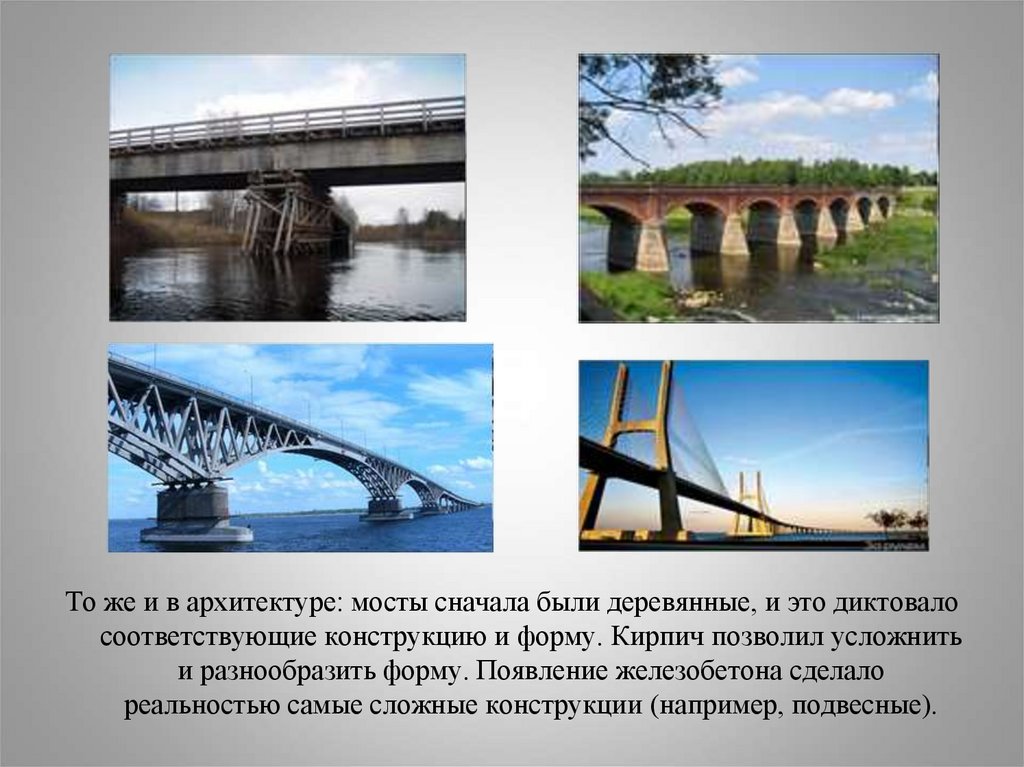 То же и в архитектуре: мосты сначала были деревянные, и это диктовалосоответствующие конструкцию и форму. Кирпич позволил усложнить