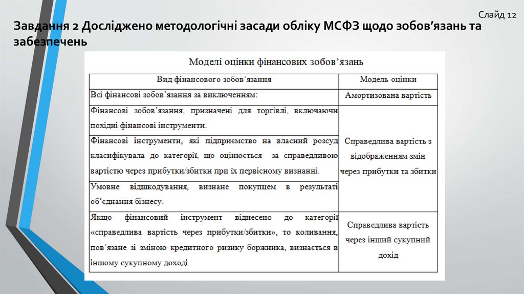 Слайд 12Завдання 2 Досліджено методологічні засади обліку МСФЗ щодо зобов’язань та