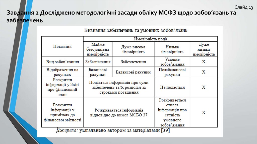 Слайд 13Завдання 2 Досліджено методологічні засади обліку МСФЗ щодо зобов’язань та