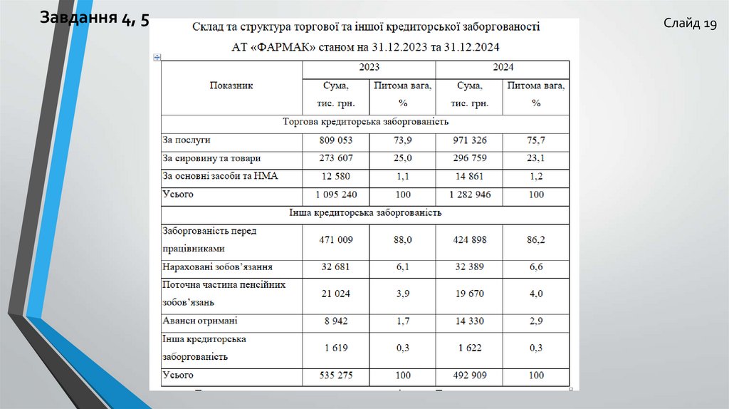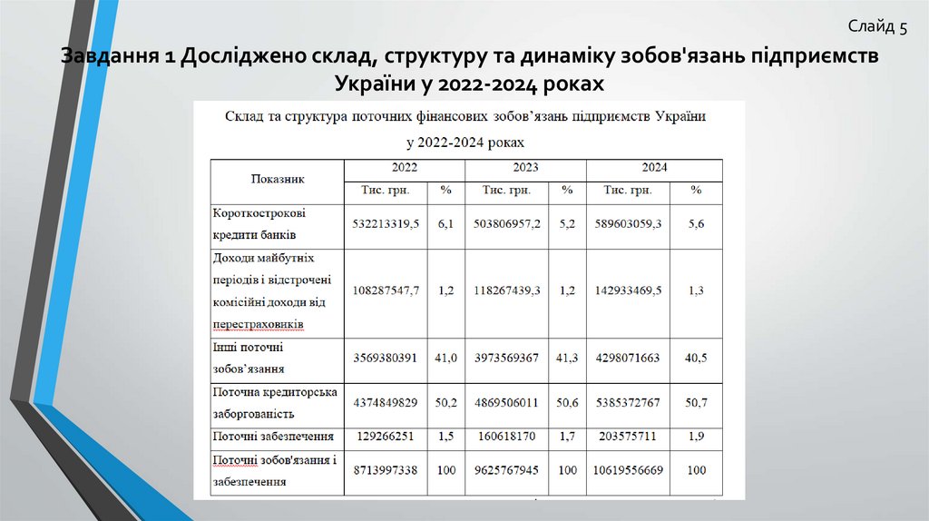 Слайд 5Завдання 1 Досліджено склад, структуру та динаміку зобов'язань підприємств