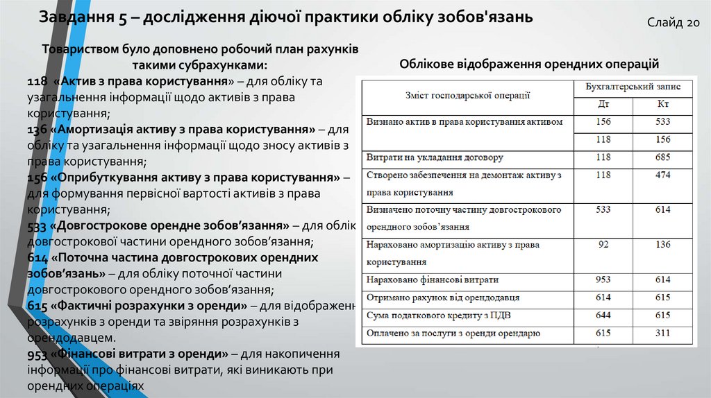Завдання 5 – дослідження діючої практики обліку зобов'язаньТовариством було доповнено робочий план рахунків