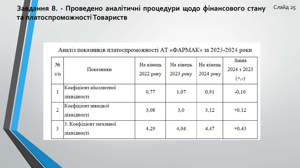 Завдання 8. - Проведено аналітичні процедури щодо фінансового станута платоспроможності Товариств