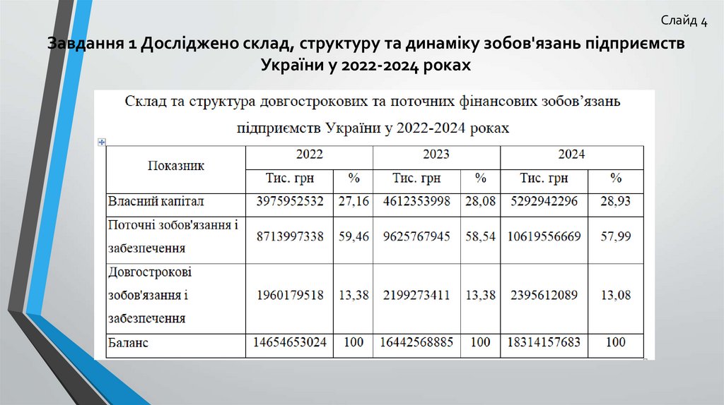 Слайд 4Завдання 1 Досліджено склад, структуру та динаміку зобов'язань підприємств