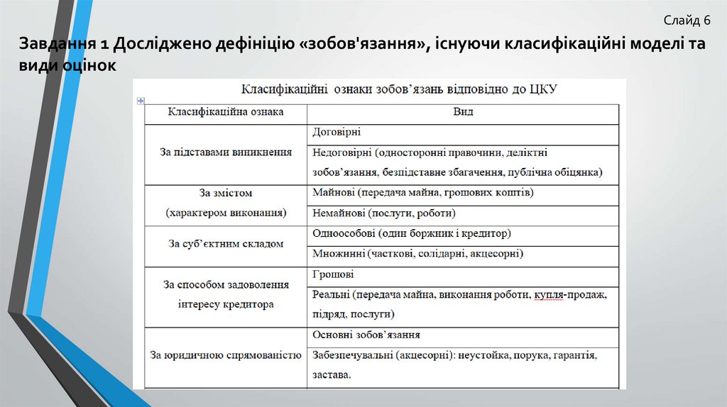 Слайд 6Завдання 1 Досліджено дефініцію «зобов'язання», існуючи класифікаційні моделі та