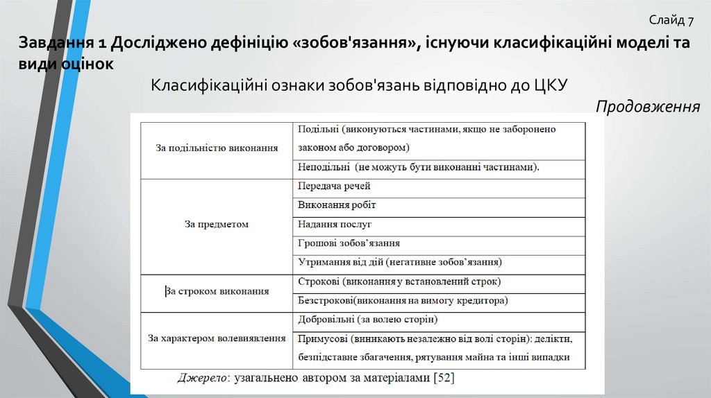 Слайд 7Завдання 1 Досліджено дефініцію «зобов'язання», існуючи класифікаційні моделі та