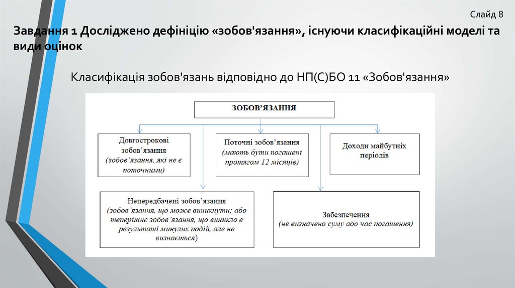 Слайд 8Завдання 1 Досліджено дефініцію «зобов'язання», існуючи класифікаційні моделі та