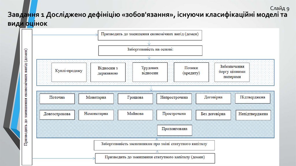 Слайд 9Завдання 1 Досліджено дефініцію «зобов'язання», існуючи класифікаційні моделі та